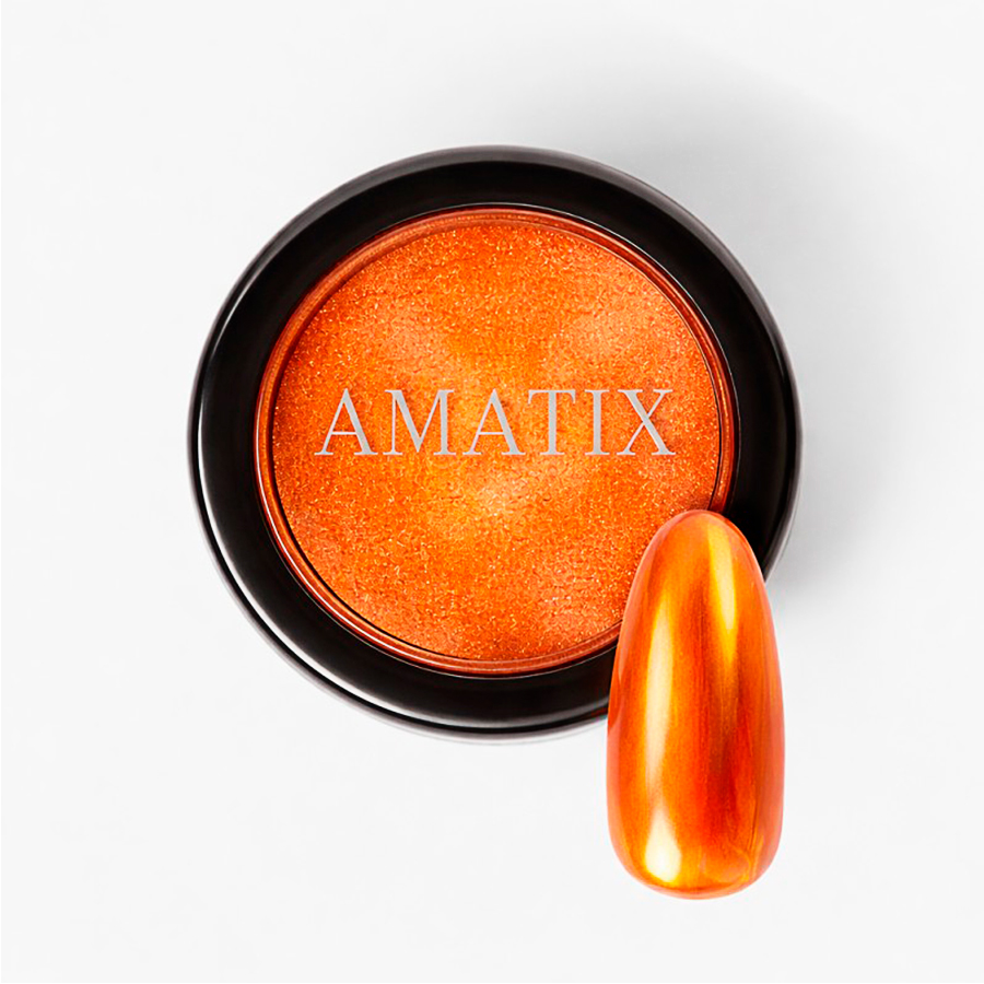 El pigmento de mica Orange Chrome de Amatix es un polvo ultrafino de efecto decorativo profesional para uñas que crea reflejos luminosos, nacarados e iridiscentes sobre la manicura, transformando cualquier diseño en un acabado brillante, sofisticado y de alto impacto visual.